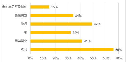 超长寒假,大学生都在干嘛?调查显示:选择实习的学生最多,占比66%;其次分别为旅游、同学聚会、走亲访友、宅、参加学习班及其他,占比分别是49%、41%、34%、32%、15%。