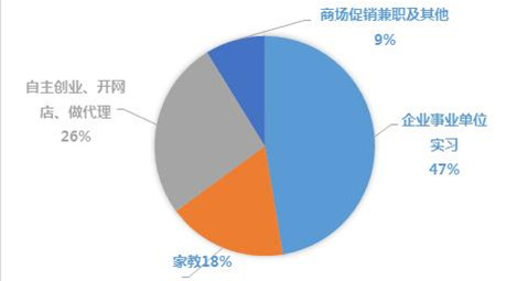 在实习形式上,除了找机会进企业和事业单位之外,大学生也把目光瞄向创业市场。调查显示:44%的大学生会选择去企业事业单位实习,22%的大学生进行自主创业、开网店、做代理,18%做家教,商场促销兼职及其他占比最少为9%。