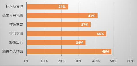 开销中,有几笔花费值得一提。首先,给亲人买礼物占比41%,90后虽然不善于跟亲人交流,但是会用其他方式表达亲情;同时,90后寒假的实习支出占比高达46%,多见于异地实习衣食住行等费用;第三,旅游支出占比34%,与寒假气候、春节等因素相关,大学生多选择就近游;最后,添置个人物品占比最高49%,看来一年到头,大家还是愿意好好犒劳一下自己。